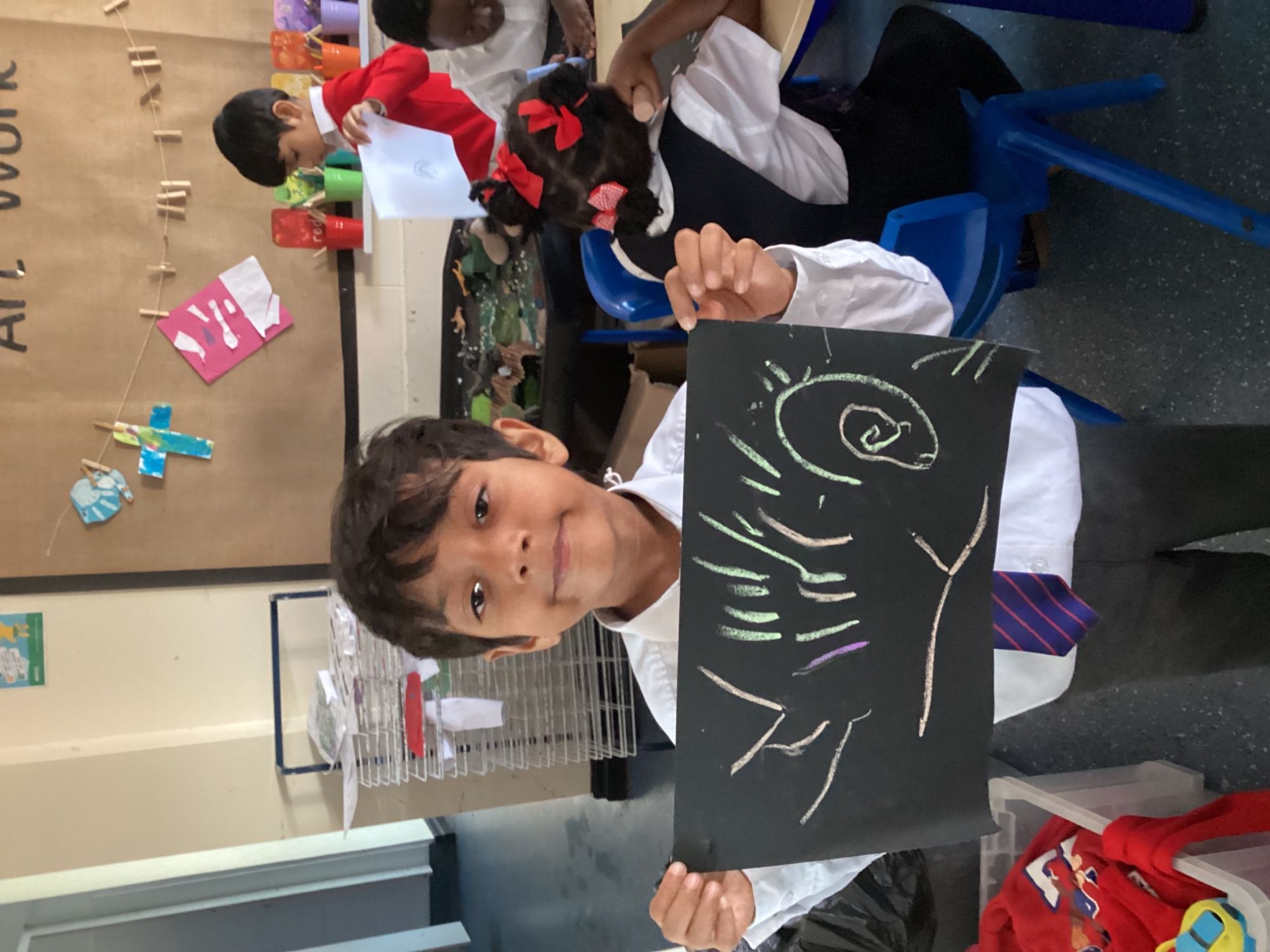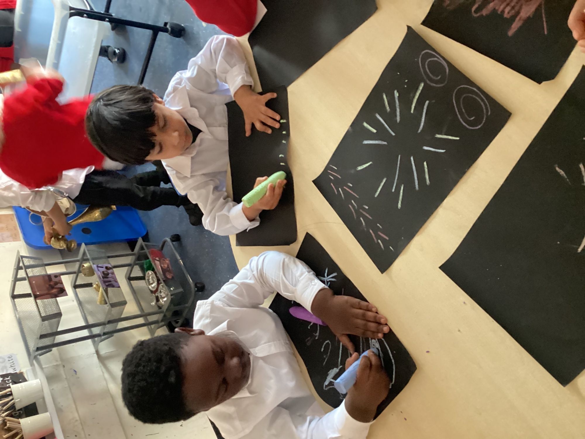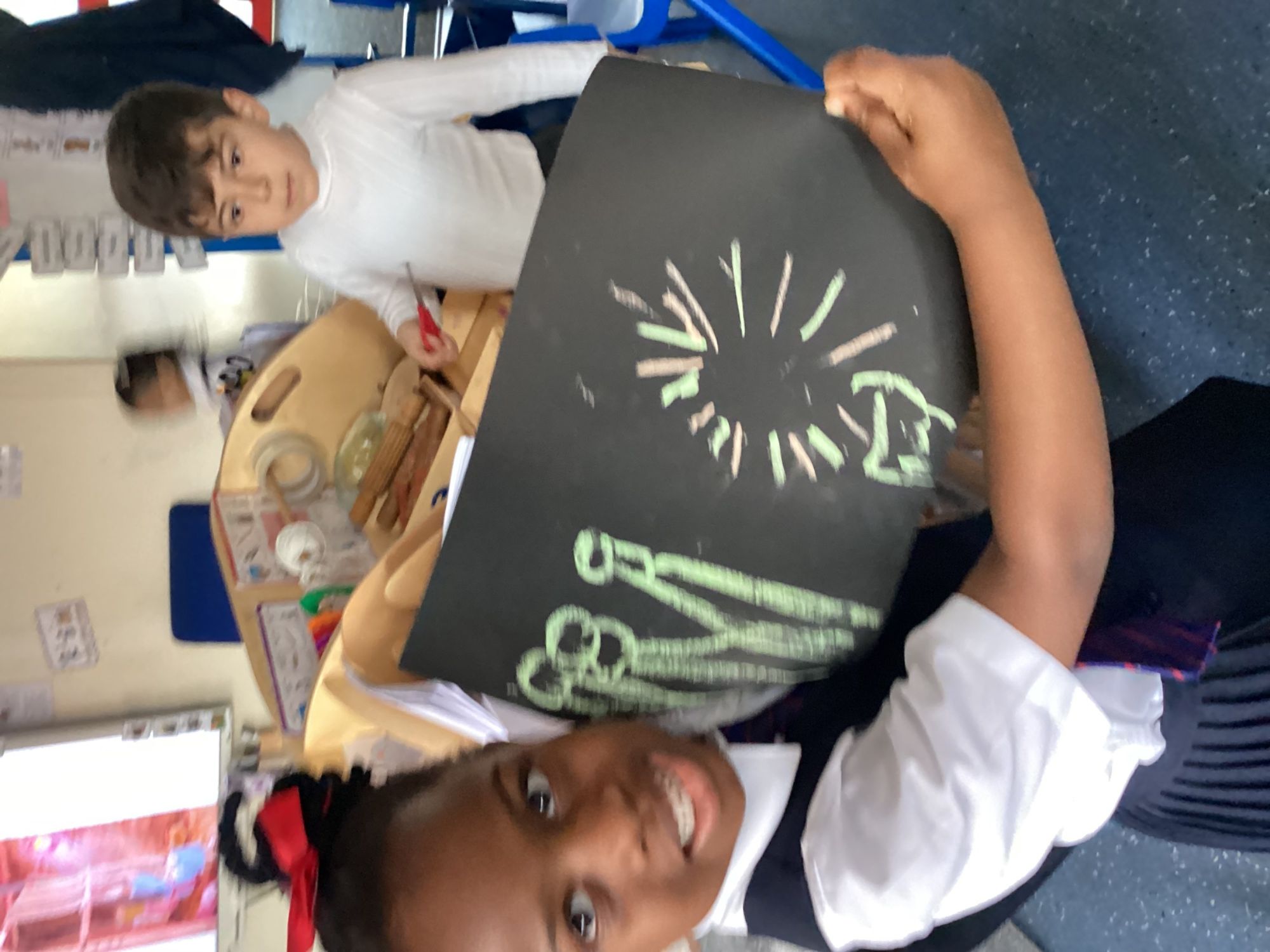 This week, the children enjoyed learning about Bonfire Night! They created their own fireworks on black paper using chalk, exploring patterns and developing their creativity. They also made their own firework dances, using their imagination to think about firework sounds, which helped build their communication and language skills. Moving their bodies to represent fireworks supported their gross motor development, while encouraging creativity, confidence, and fun through active learning.