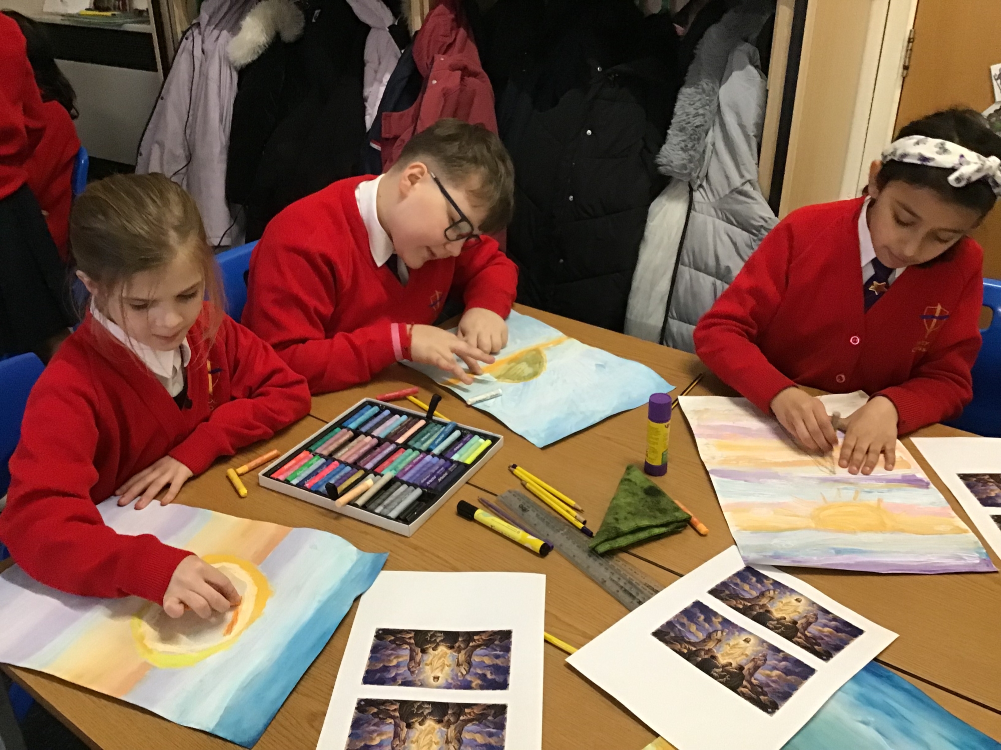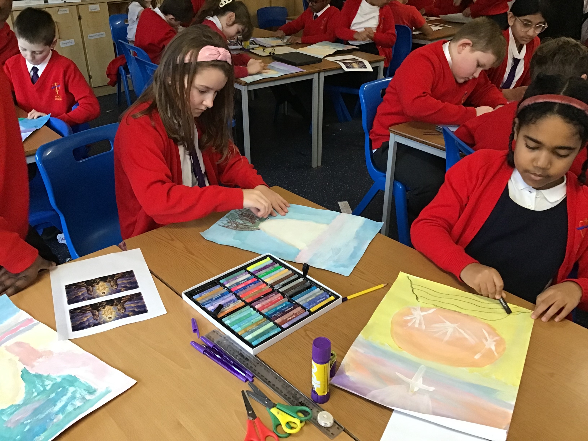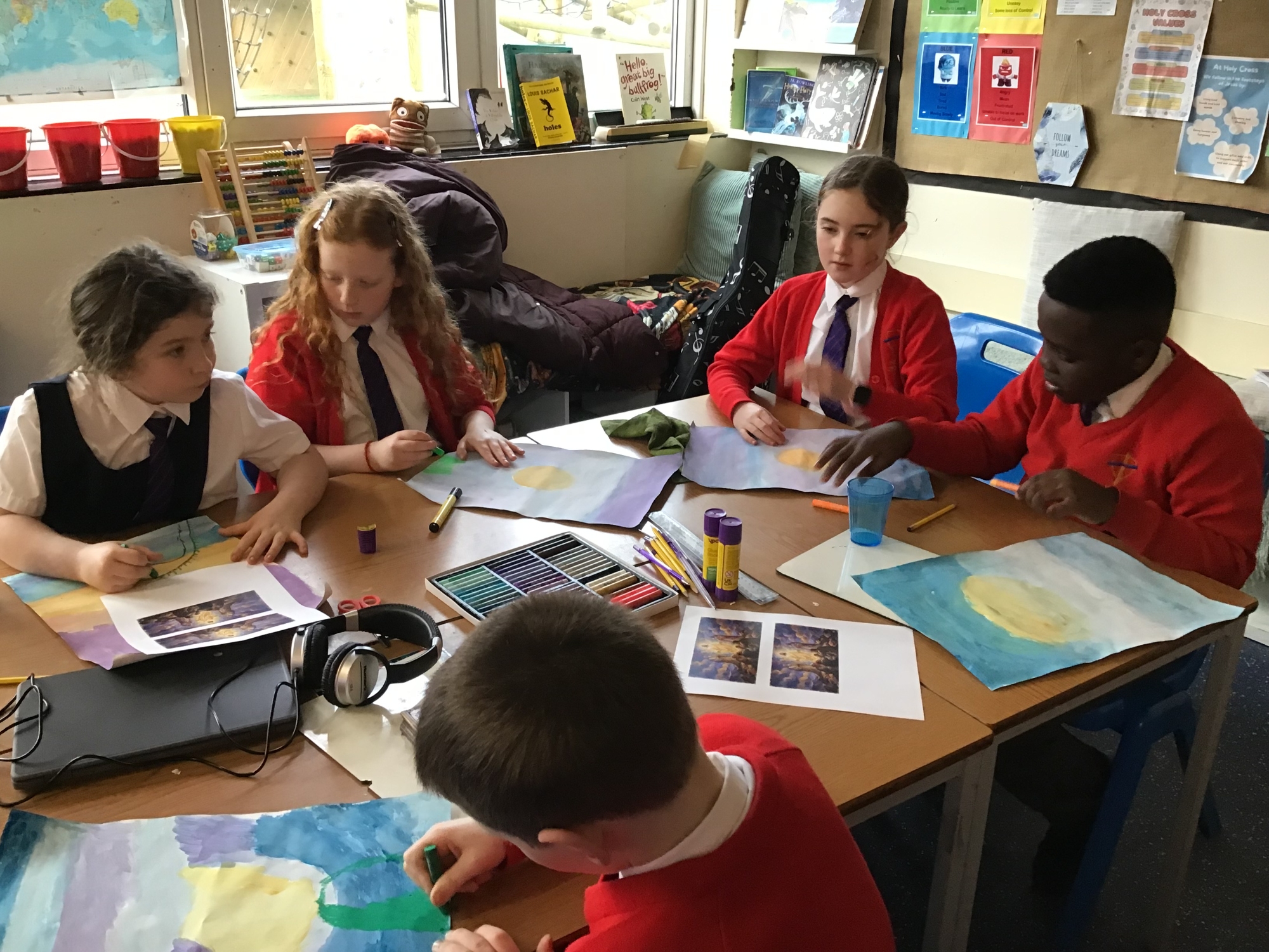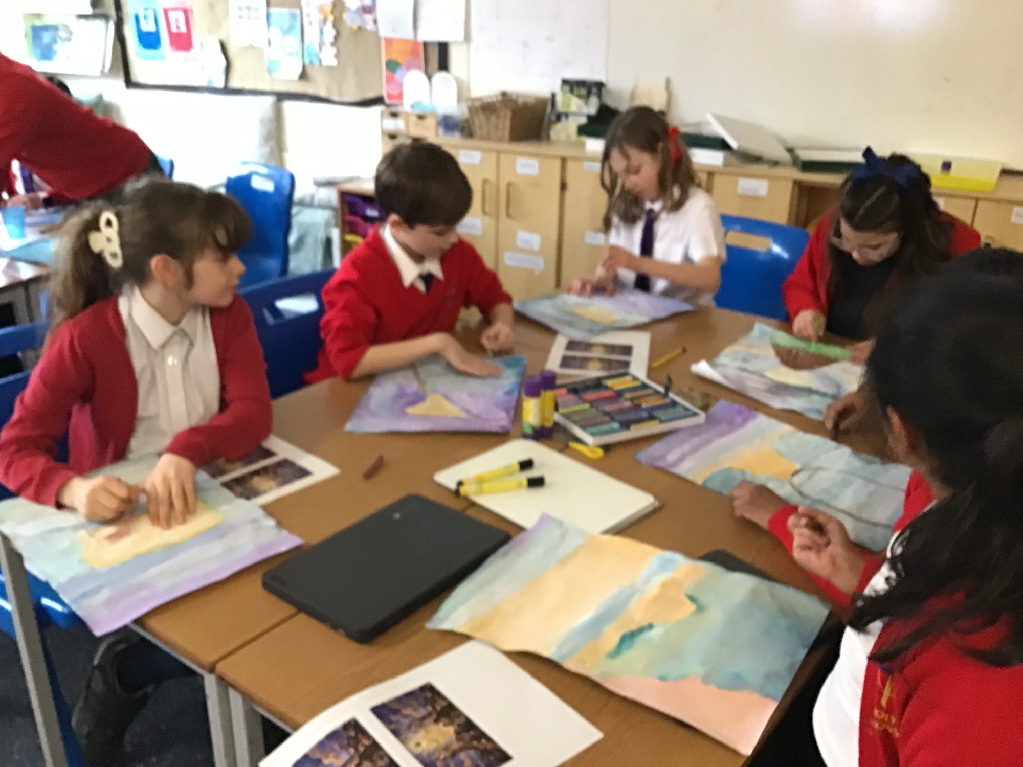 RE - Year 5 created artwork to represent the Transfiguration of Jesus, using paints and oil pastels. They explored colour, light, and texture to express the significance of this event and to reflect their understanding through creative work.