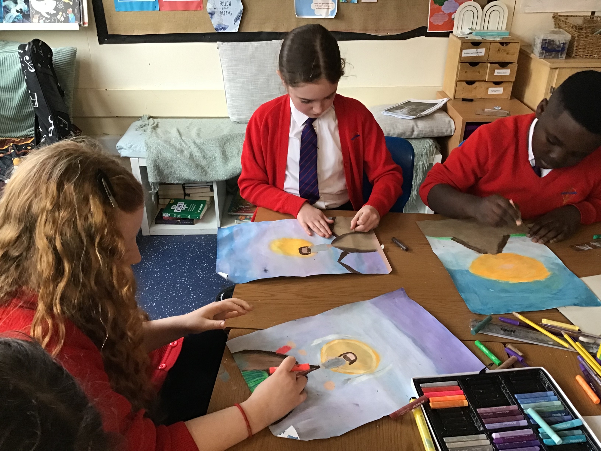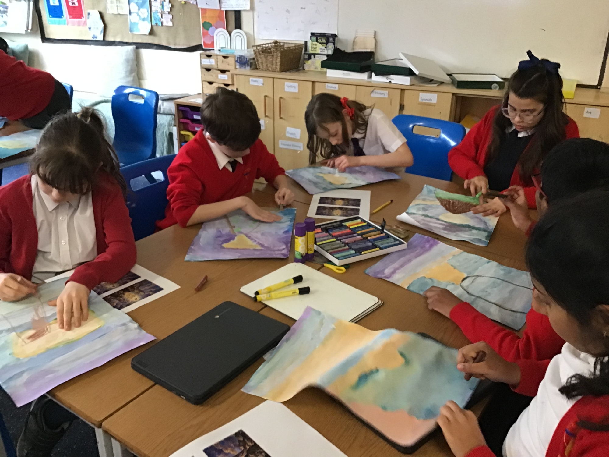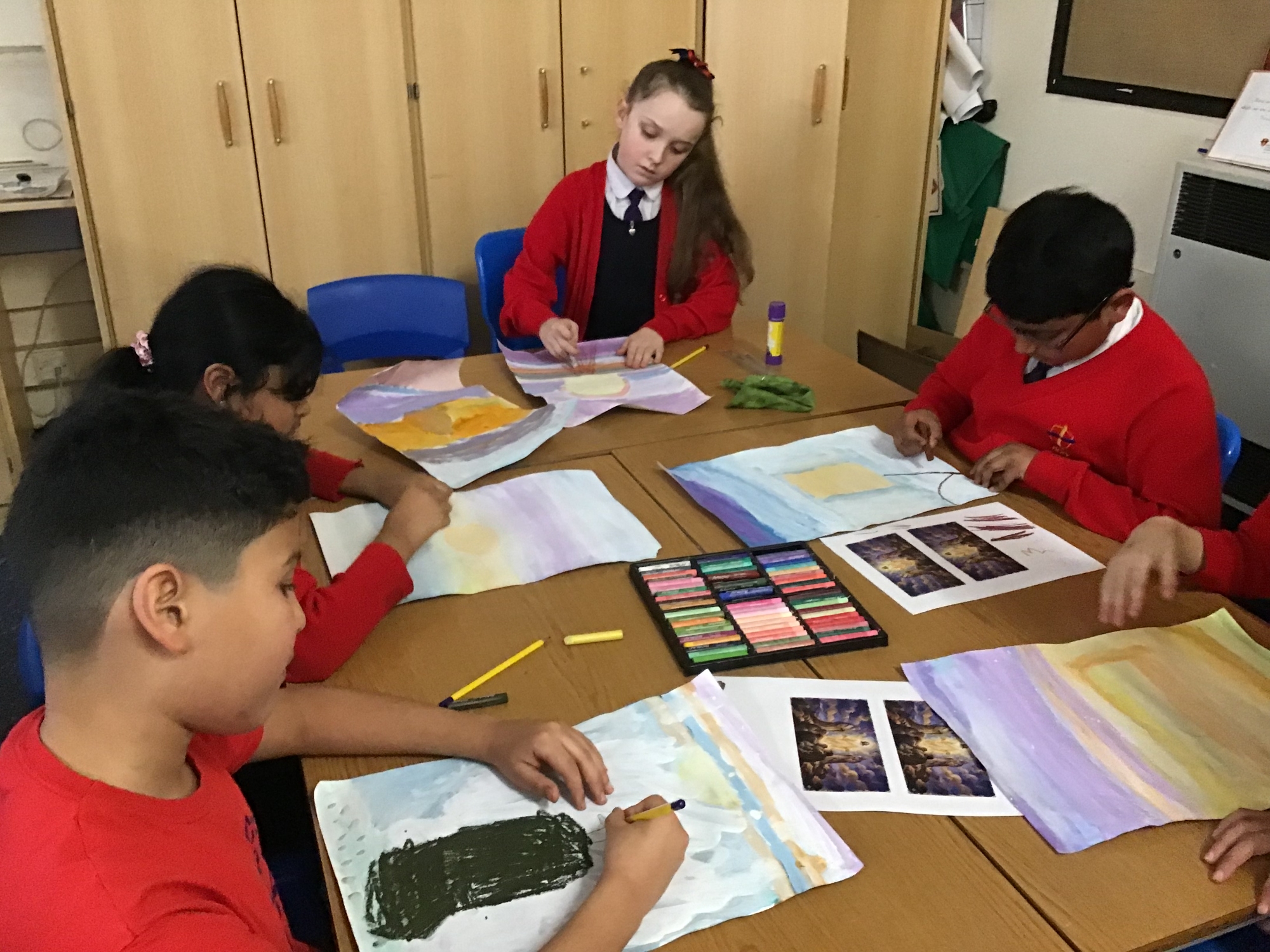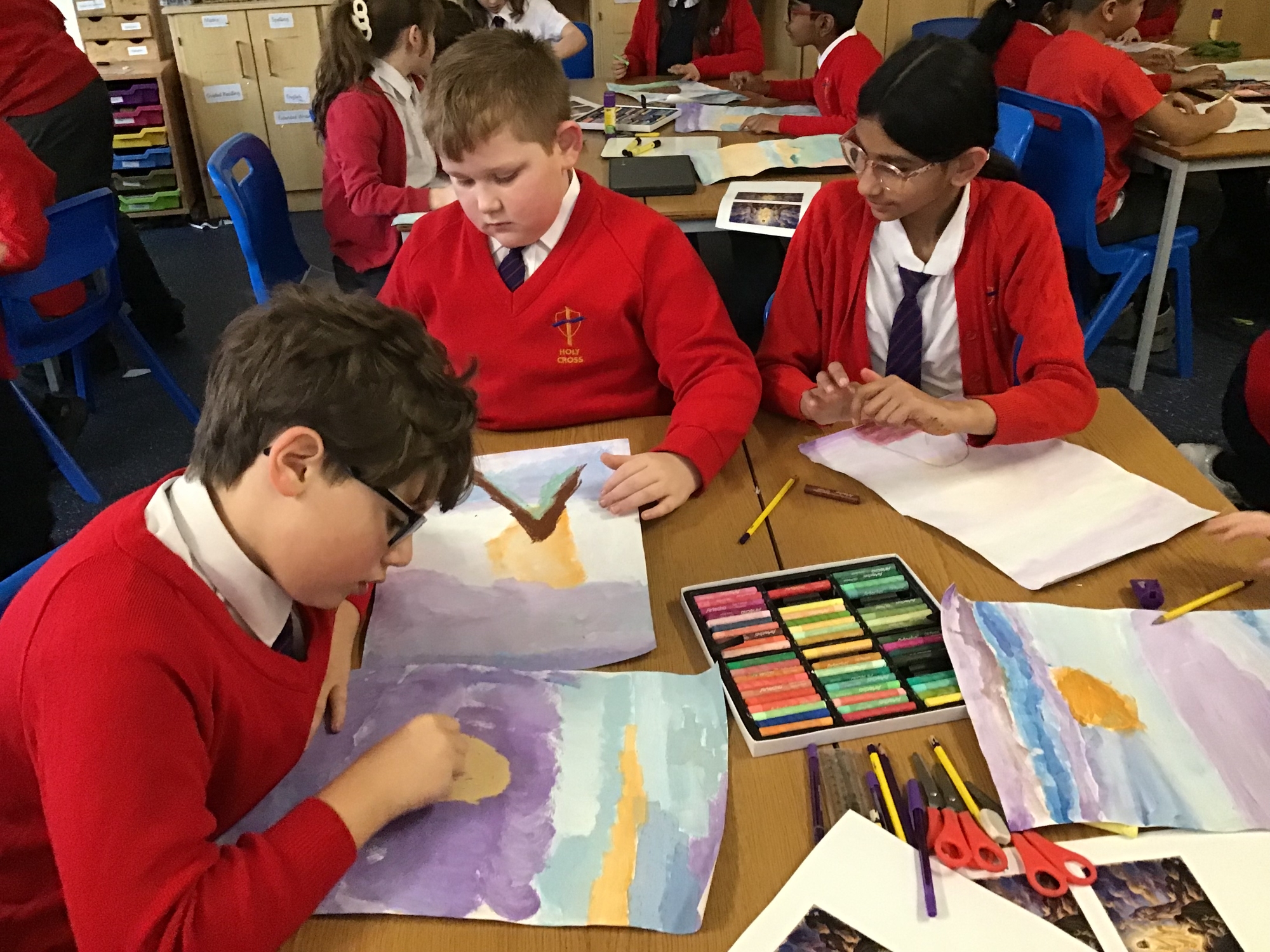 RE - Year 5 created artwork to represent the Transfiguration of Jesus, using paints and oil pastels. They explored colour, light, and texture to express the significance of this event and to reflect their understanding through creative work.