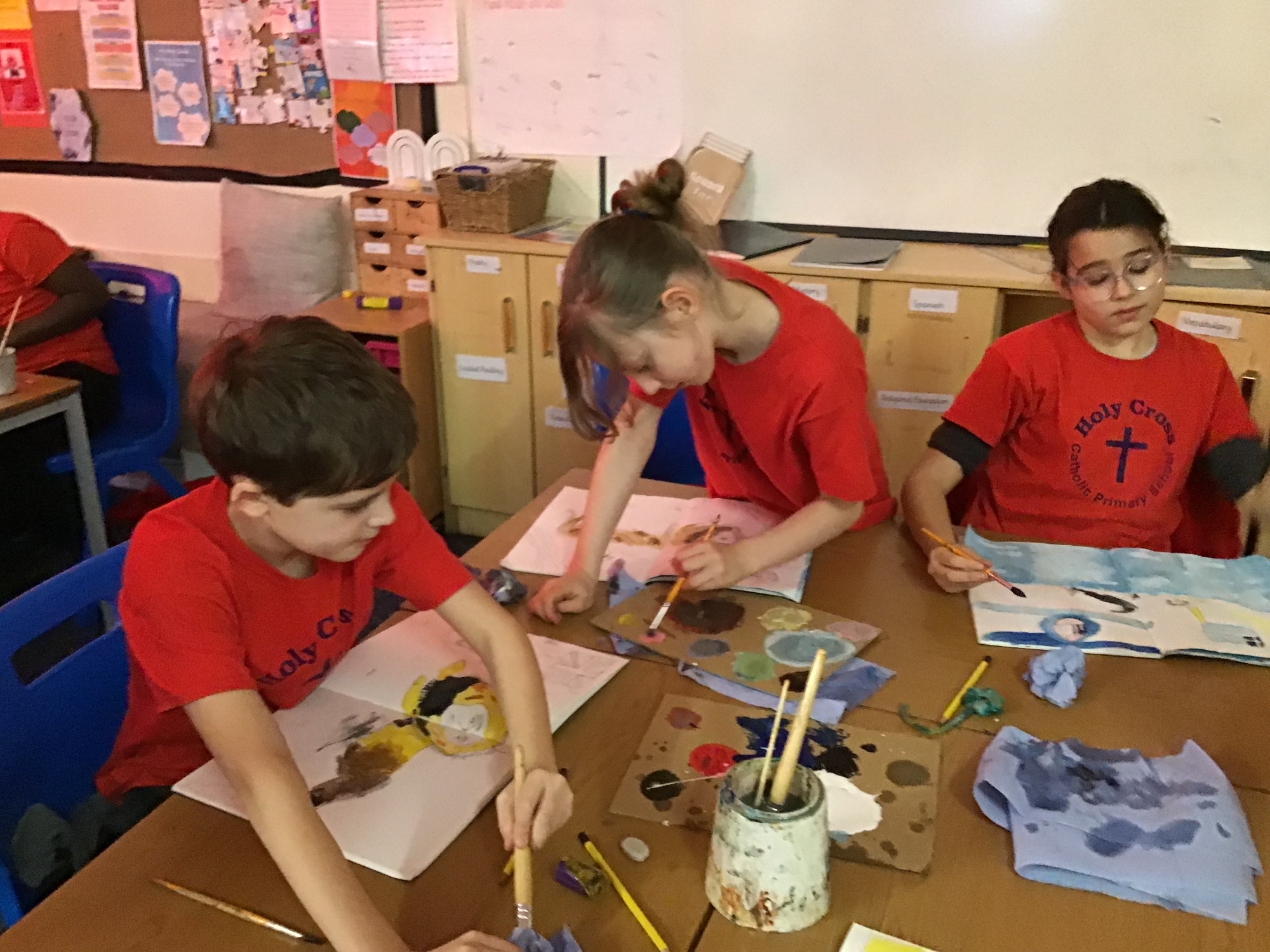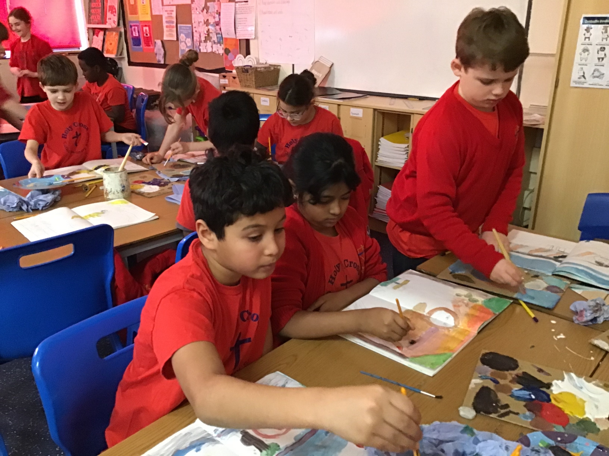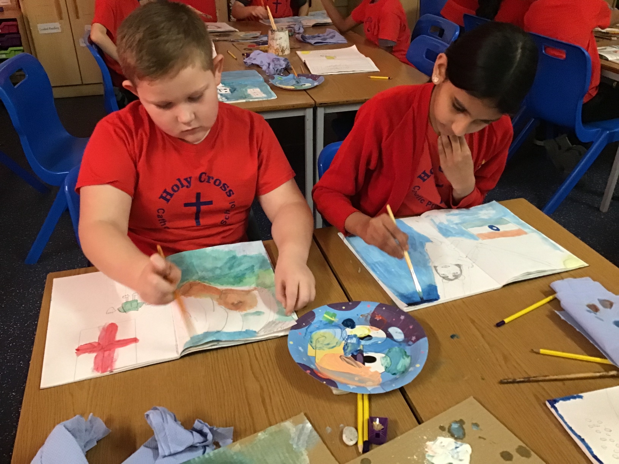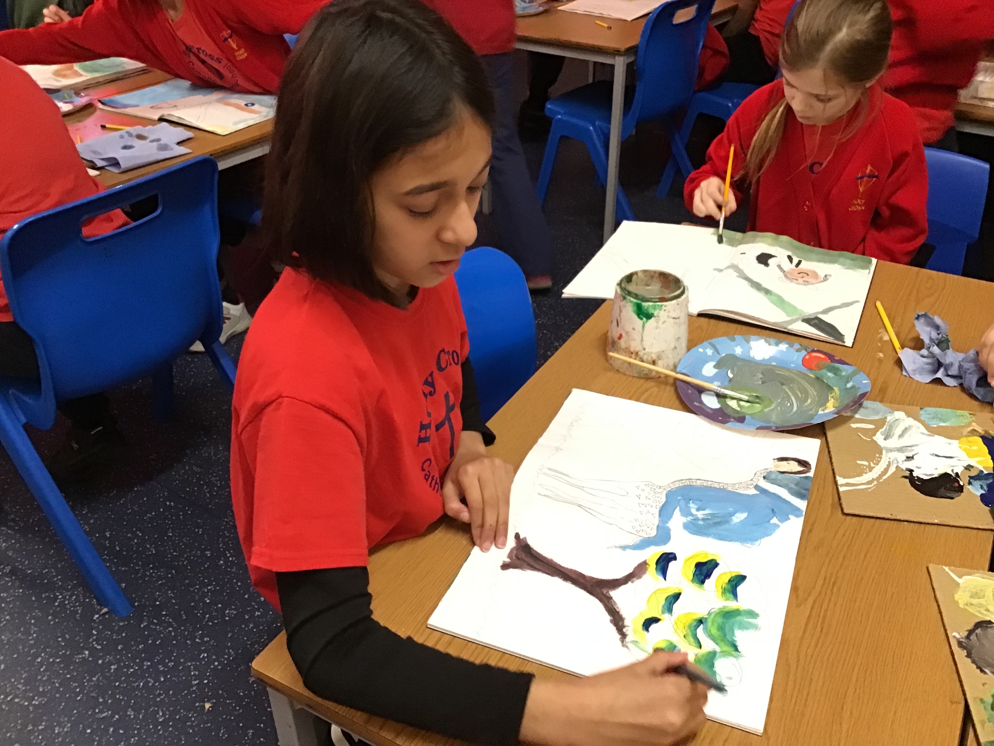 RE - Year 5 created artwork to represent the Transfiguration of Jesus, using paints and oil pastels. They explored colour, light, and texture to express the significance of this event and to reflect their understanding through creative work.