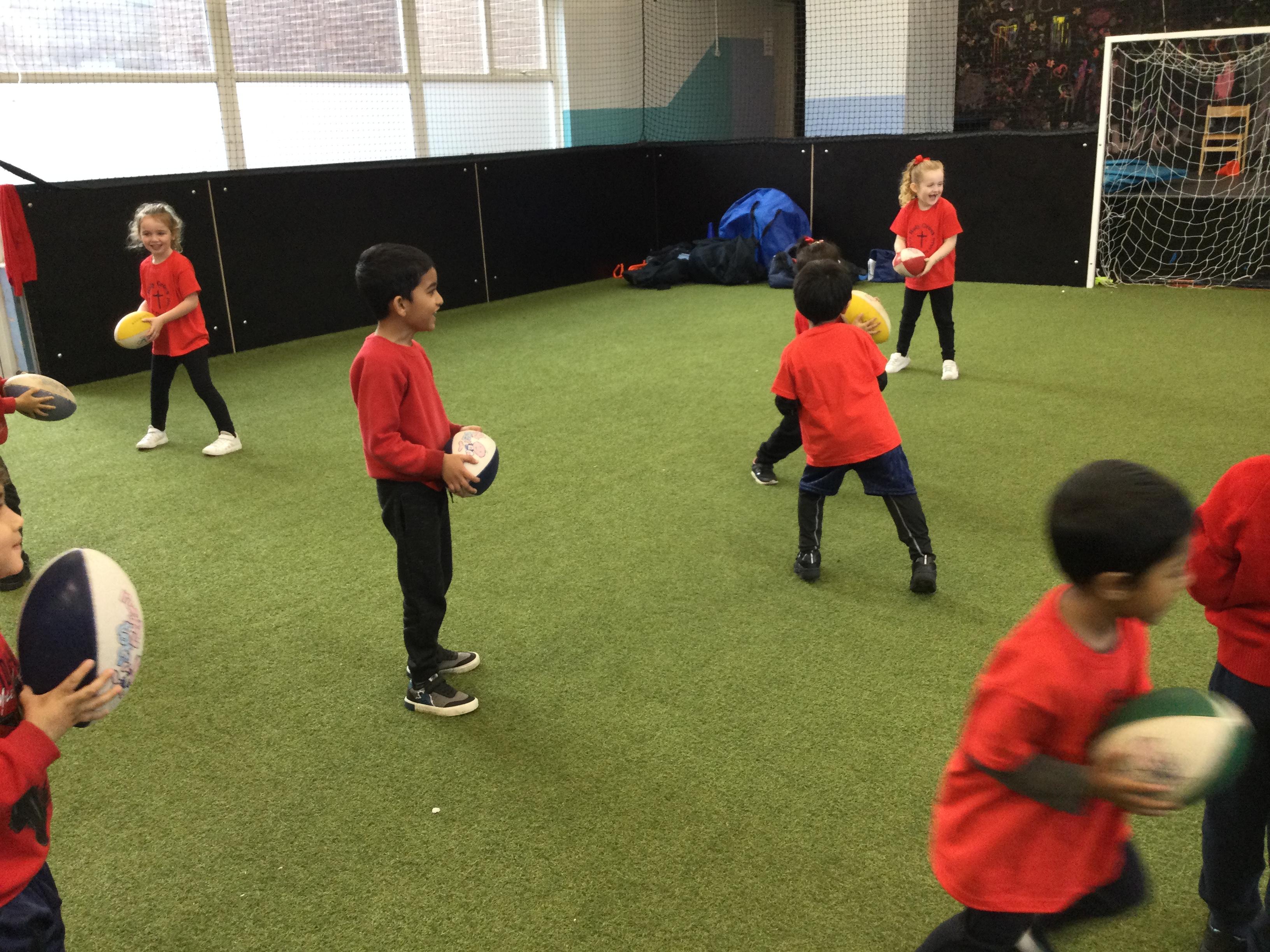 Reception are currently taking part in Rugby Tots. They are developing their gross motor skills and learning how to negotiate space and obstacles. Everyone really enjoys these sessions and they have so much fun.